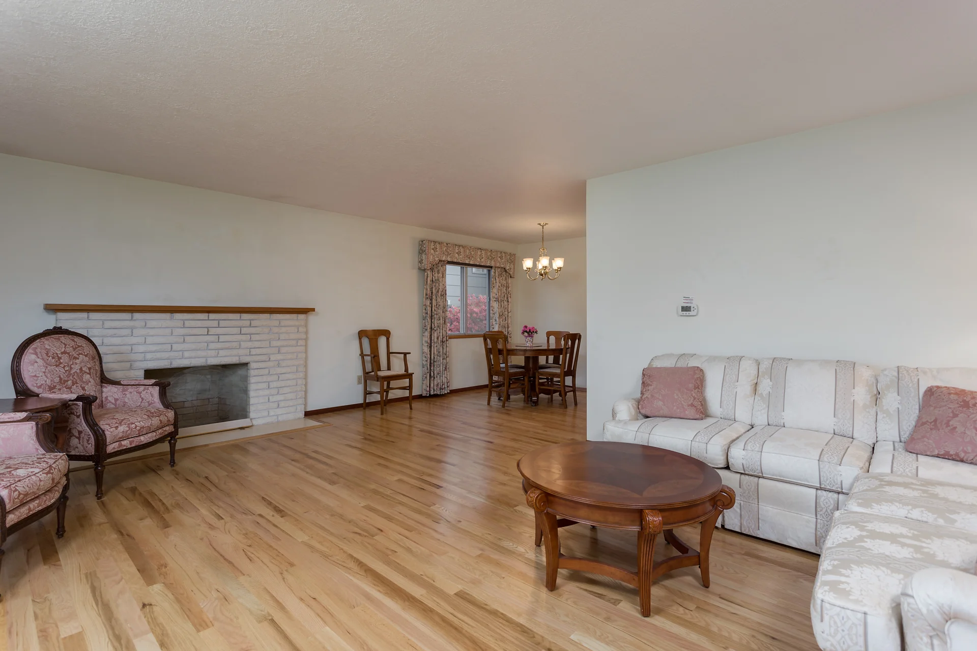 Spacious living and dining area with hardwood floors and cozy fireplace.
