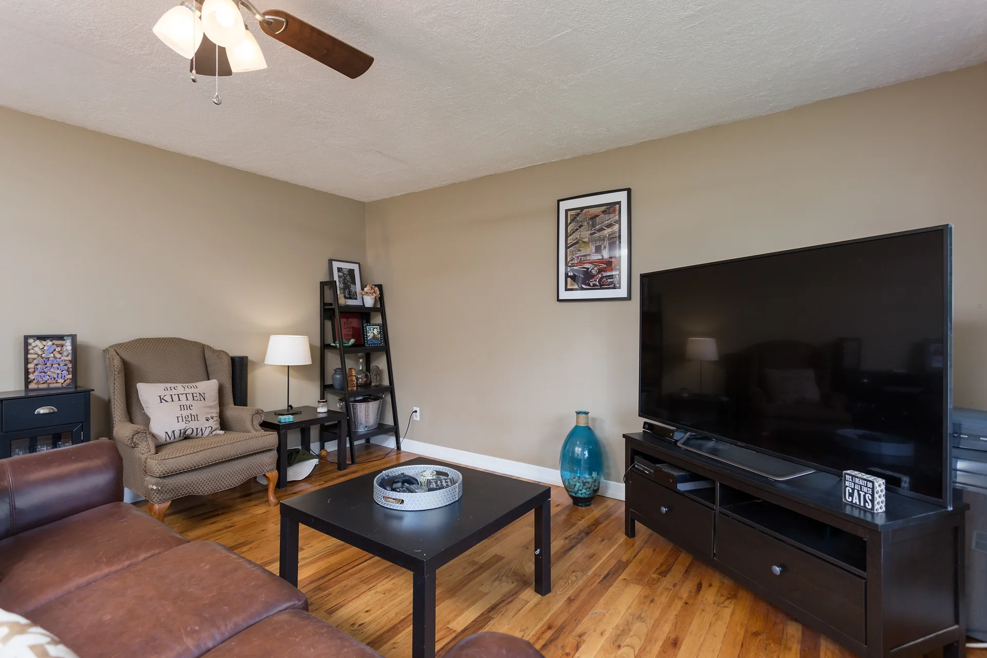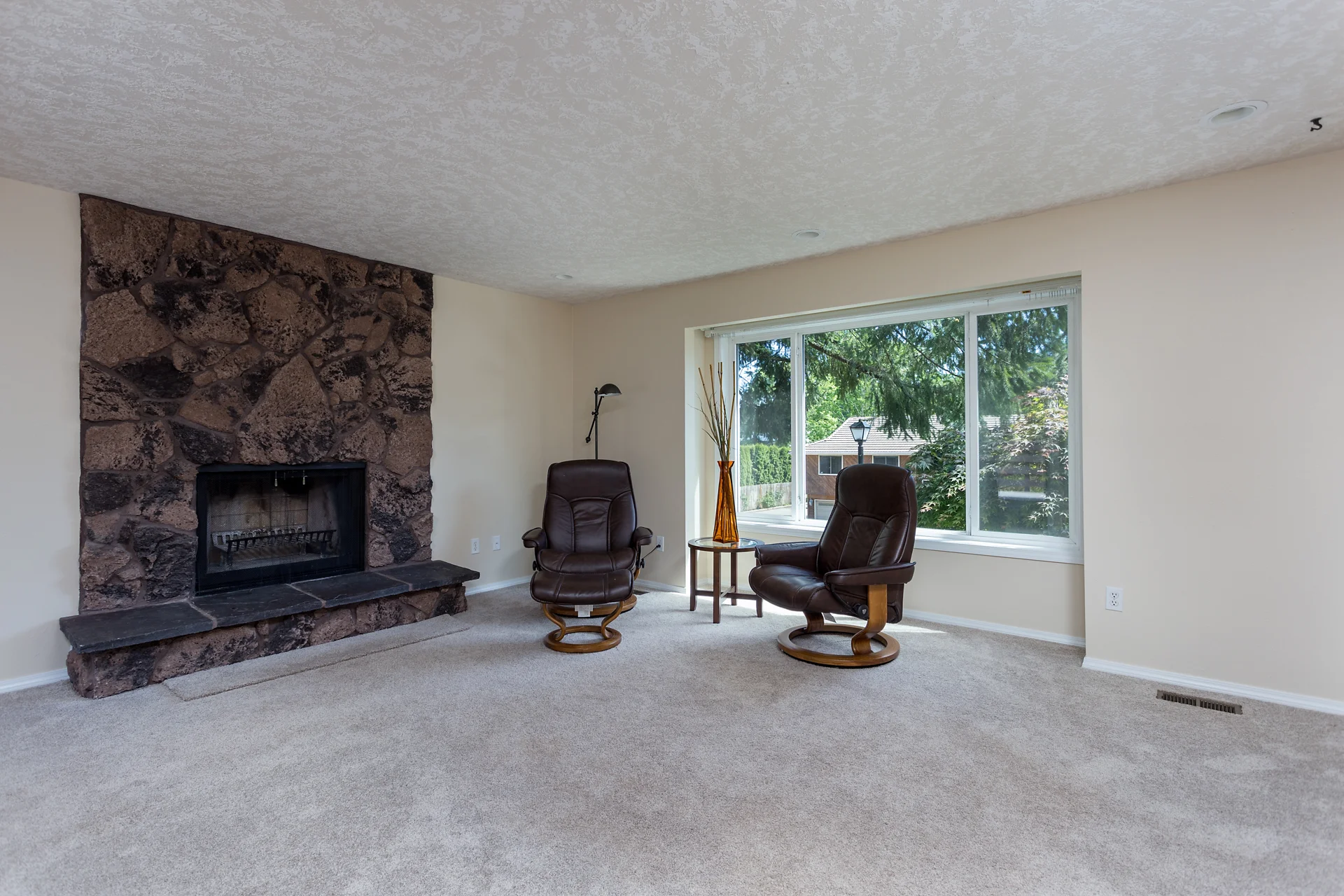 The large window in the living room overlooks the quiet neighborhood.