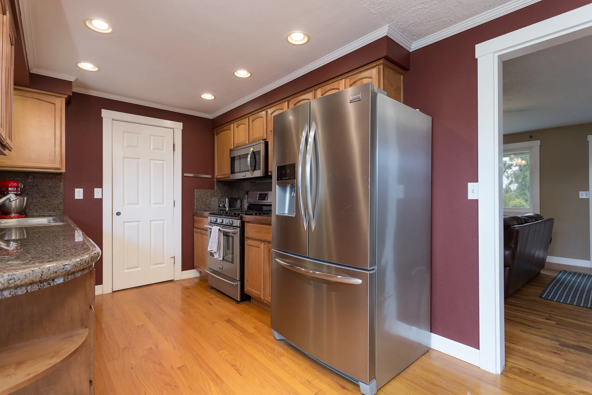 Remodeled kitchen with granite counters and stainless steel appliances.