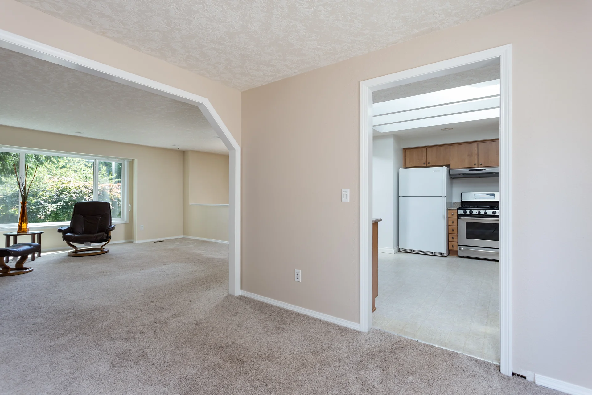 The living room looking into the formal dining room.