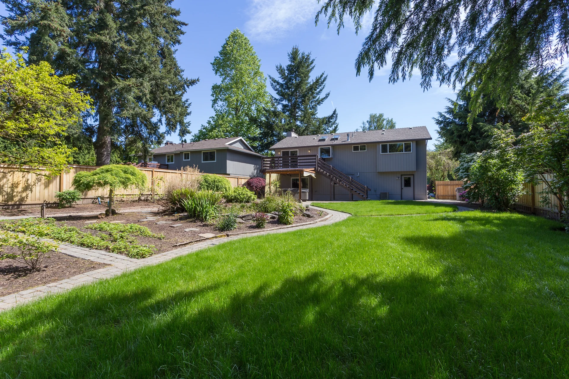 Park-like backyard with walking little walking paths among the gardens.