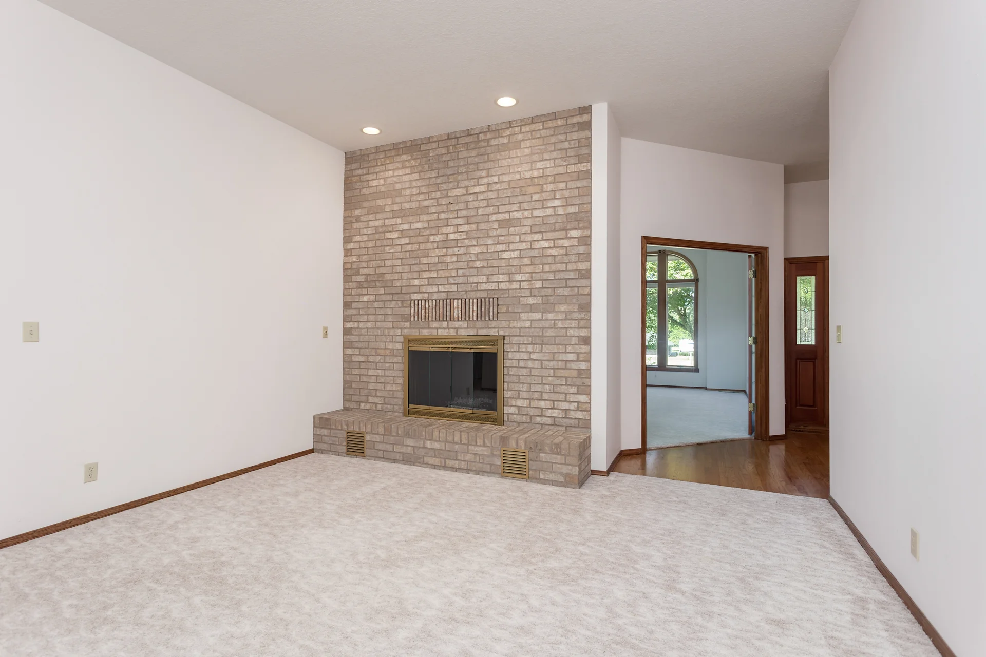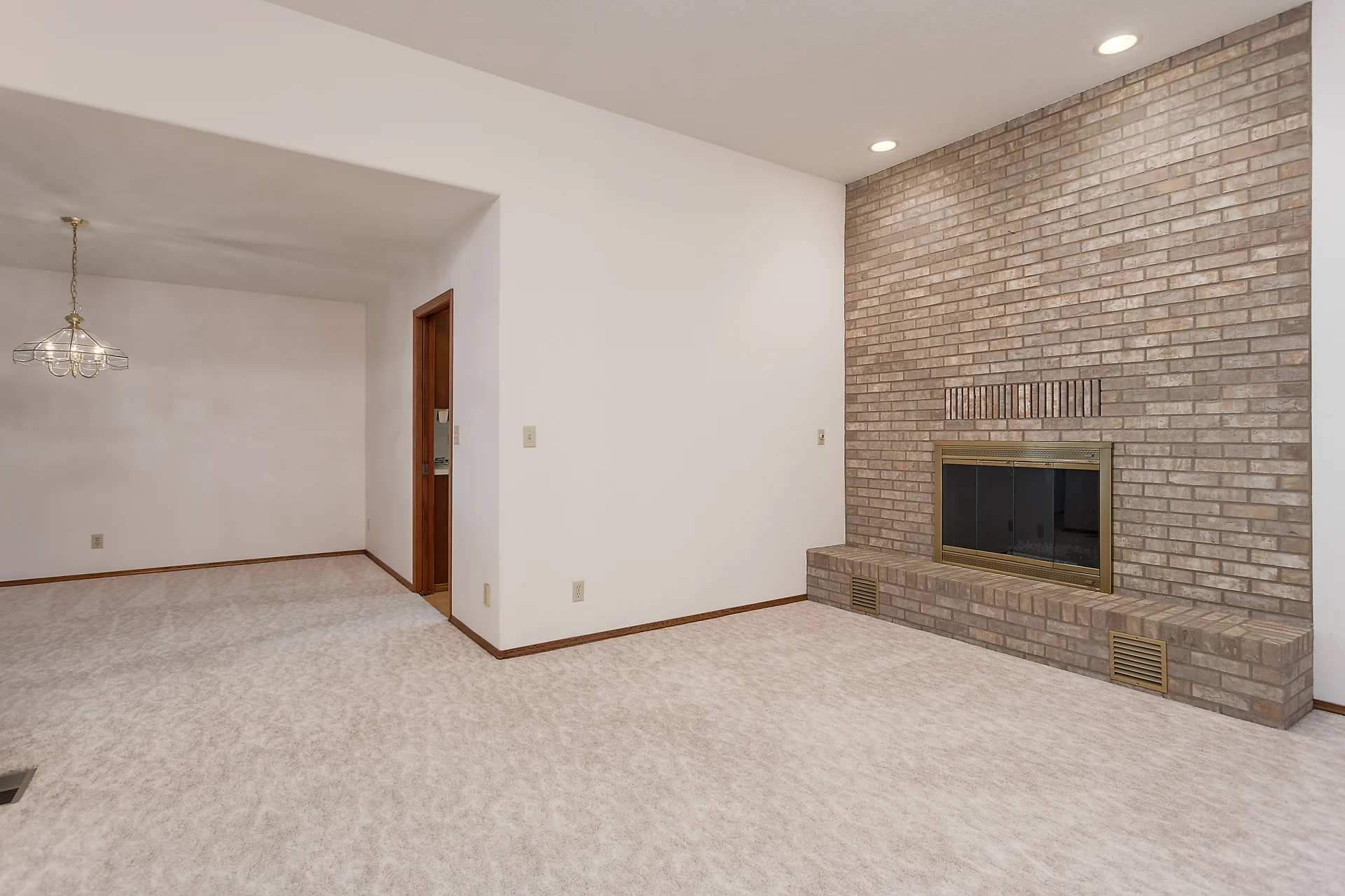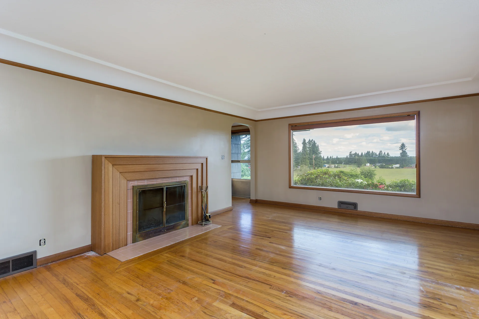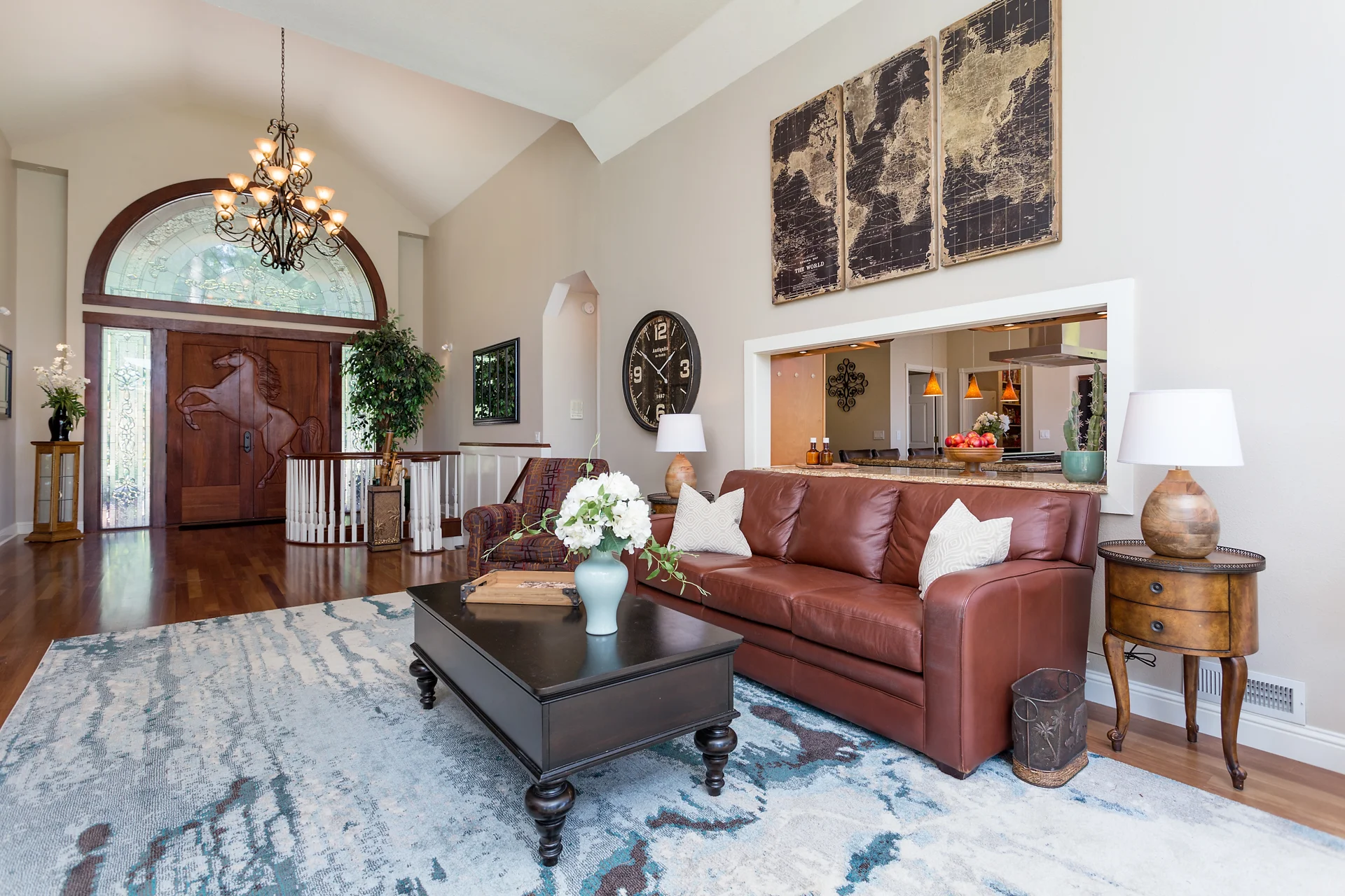 Grand living room with pass-through window to kitchen.