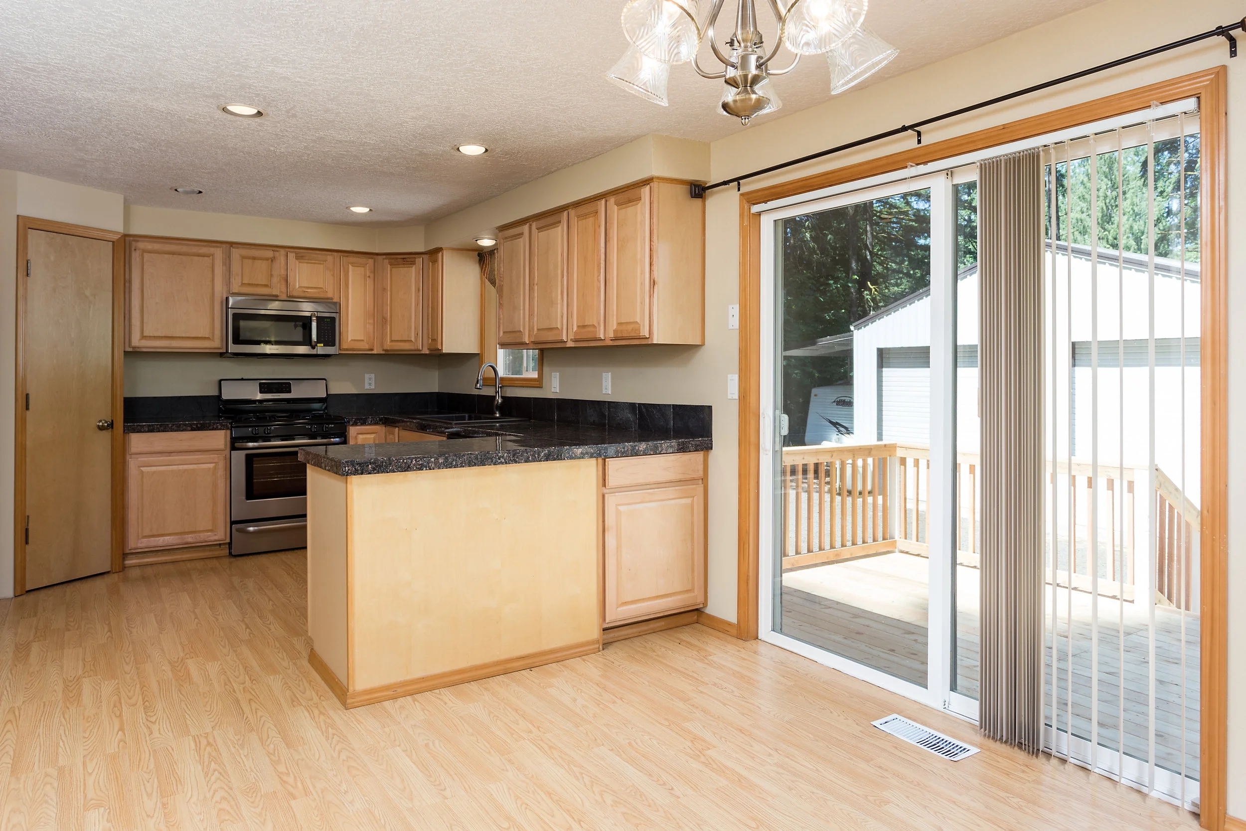 Kitchen with slider to deck overlooking large back yard with detached shop.