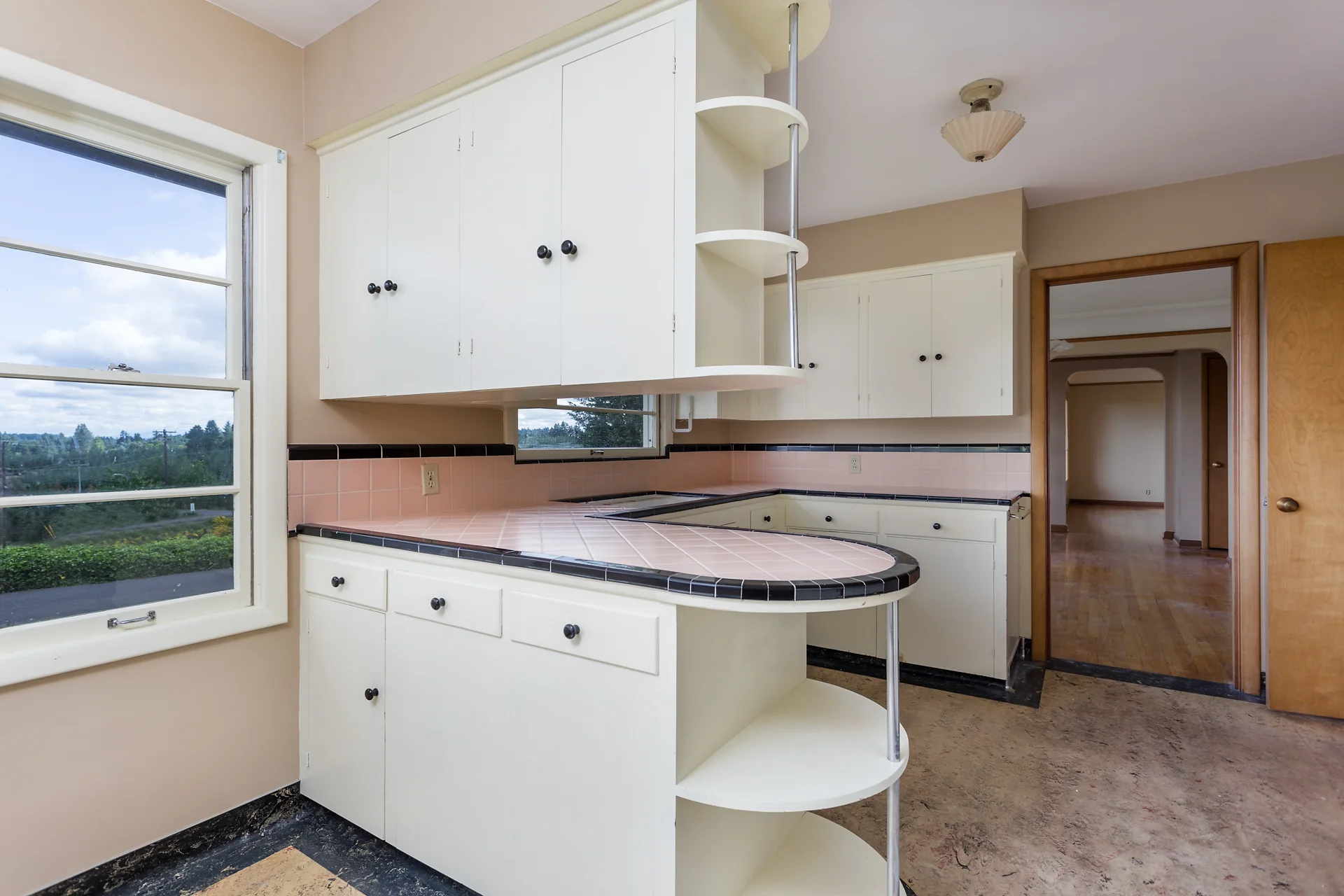 Kitchen with breakfast nook and vintage counters.