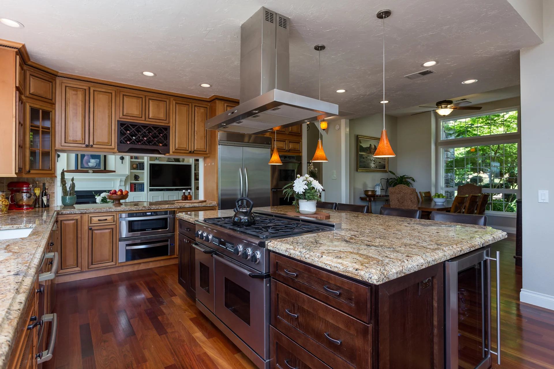 Looking at the kitchen and family room from the breakfast nook.